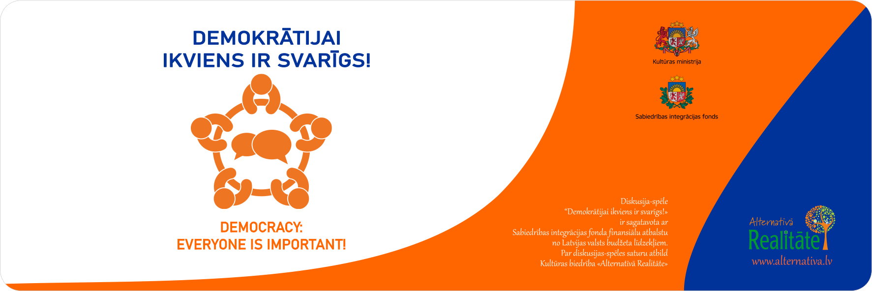 Discussion-Game “Everyone is important for democracy!” has been prepared with the financial support of the Society Integration Fund from the Latvian state budget. About Discussion-Games “Everyone is important for democracy!” The content is the responsibility of the Cultural Association “Alternative Reality”.